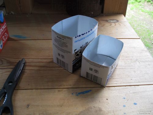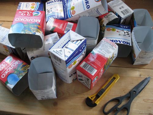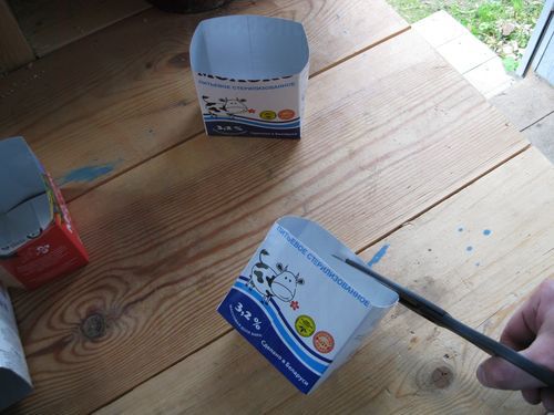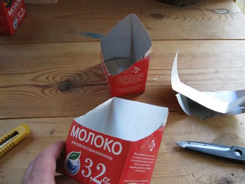 Вырезать контейнеры проще простого. Для этого просто отрезаем ножницами верхнюю часть картонного пакета на нужной высоте.