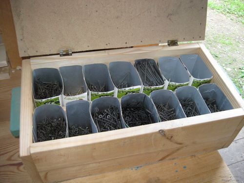 В качестве доказательства, я могу привести пример, как еще несколько лет назад я сделал деревянный ящик с крышкой, который предназначался для хранения в основном шурупов по дереву в картонных контейнерах, вырезанных из молочных пакетов.