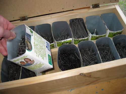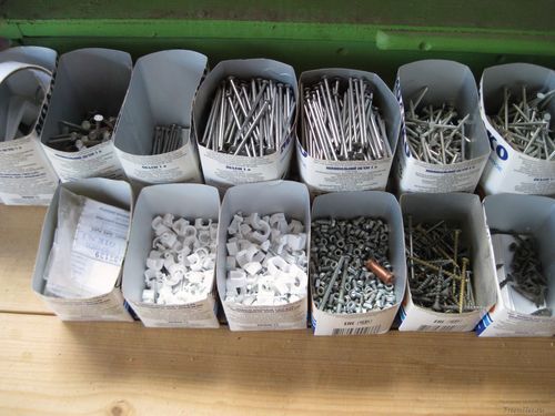 Это хранение крепежа и различных мелочей в контейнерах, вырезанных из картонных пакетов от молока.