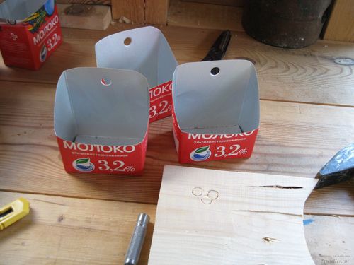 Очень простые в изготовлении самодельные контейнеры для хранения различного крепежа (гвоздей, шурупов, болтов, гаек и т.п.) и других мелочей, сделанные из картонных пакетов от молока.