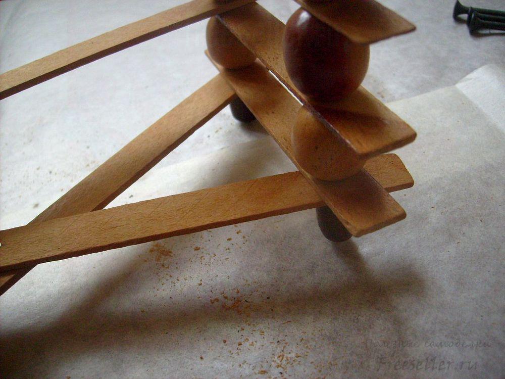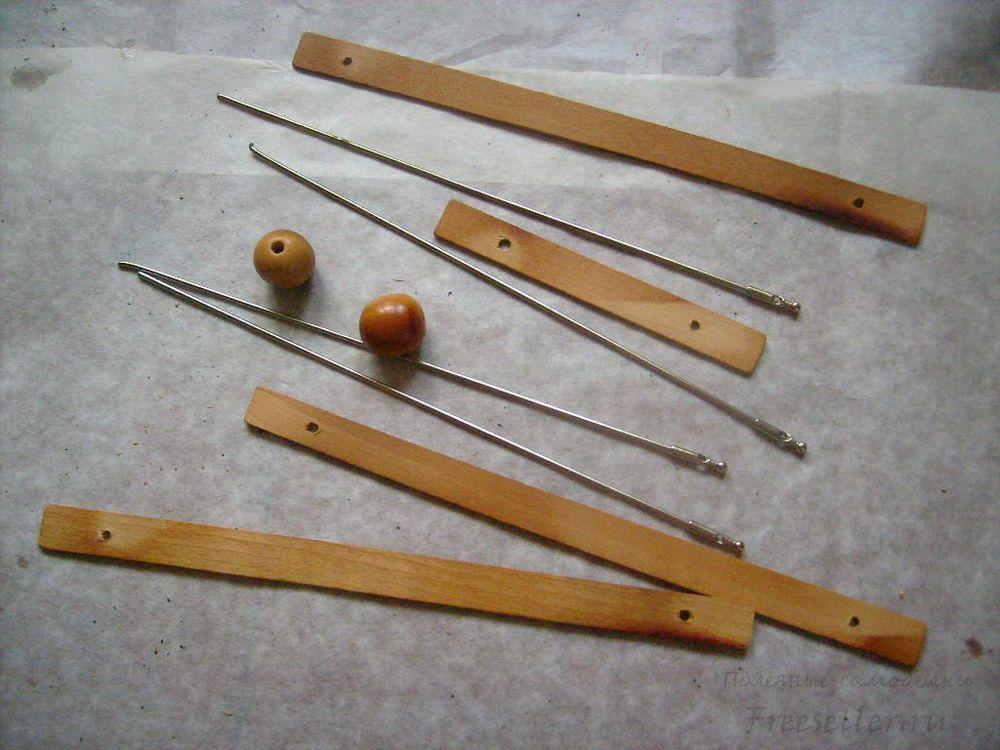 Только прежде нанижем на спицы небольшие, тоже деревянные бусины - для устойчивости.