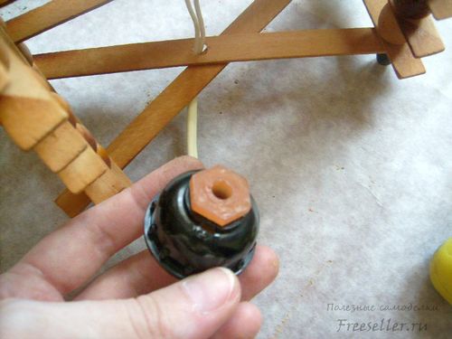 От старого абажура, собранного по принципу деревянной шторы из нанизанных на леску планок разной длины и бусин, у нас остались разрозненные детали. Мы решили пустить их в дело, в некотором роде поиграть в конструктор. Каркас нового светильника составили четыре укороченные спицы от старого зонтика с запаянными на концах петлями. Кроме того, мы использовали электрический патрон и провод с переключателем, клей, немного ваты и отвёртку.