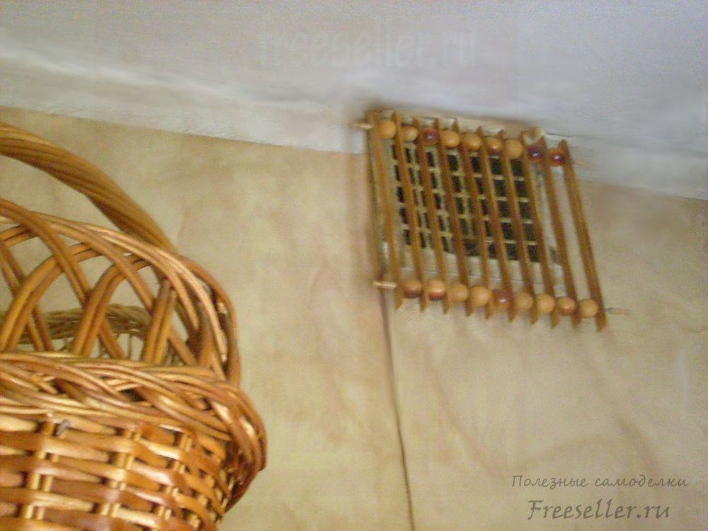Собрать такую декоративную деревянную шторку для вентиляционного отверстия можно всего за несколько минут. Прикроем неприглядную решётку в стене, не нарушая вентиляцию кухни. Наши "жалюзи" состоят из деревянных планок и бусин, двух отпиленных от спиц старого зонтика фрагментов нужной длины, а также четырёх пластмассовых наконечников от этого же зонтика. Кроме них, нам понадобятся клей и немного ваты.