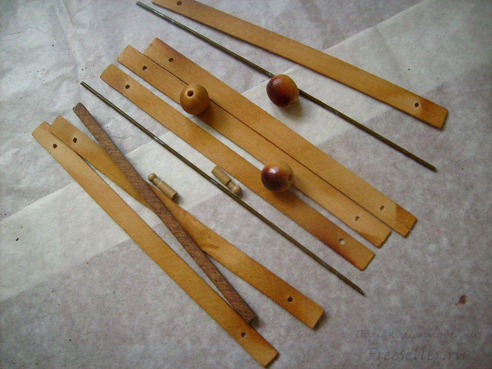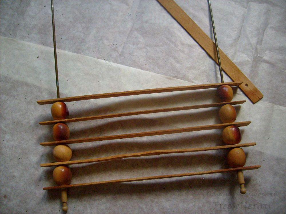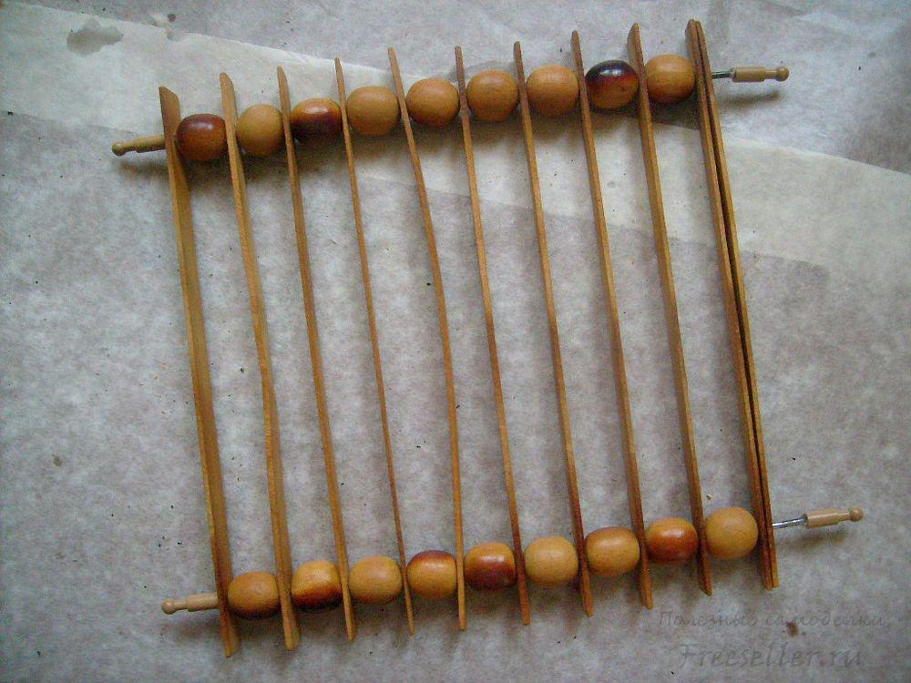 2. Начинаем собирать нашу шторку. Нанизываем на спицы планки поочерёдно с бусинами.