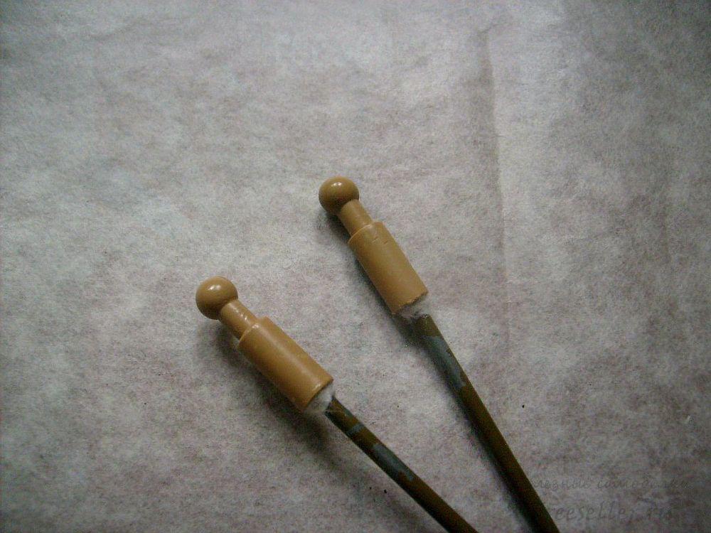 1. Обматываем концы двух спиц с одной стороны пропитанной клеем ватой. Сажаем на них пластмассовые наконечники.