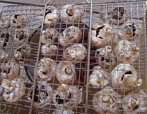 Выложите шампиньоны в сетку для гриля. Их не удобно нанизывать на шампура - текстура гриба рассыпается и ломается.