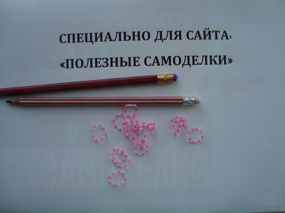 Для плетения браслета подготовьте резинки (растратится около 40-50 шт) и пару карандашей, крючок, сцепка.
