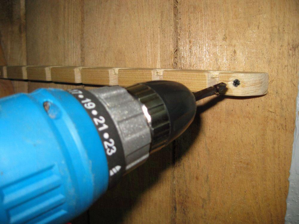 Но на такой высоте (примерно 1,6-1,7 метра), простенький держатель со сквозными отверстиями был бы не очень удобен. Поскольку во-первых на такой высоте, отверстия в которые необходимо вставлять отвертки практически не видны (в итоге каждый раз придется тыкать отверткой наугад, пока попадешь в отверстие), а во-вторых неудобство заключается в том, что для того чтобы вытащить или вставить отвертку, необходимо достаточно высоко поднимать ее над держателем. Естественно это очень неудобно (особенно для длинных отверток), поскольку каждый раз придется очень высоко задирать руку.
