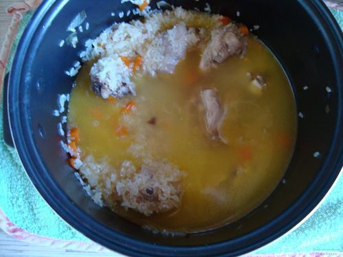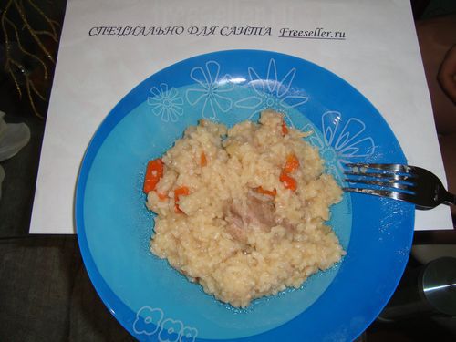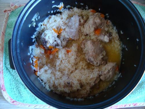 Остается лишь выбрать в меню программы мультиварке слово "плов" и через указанное время (около часа) нежное блюдо готово.