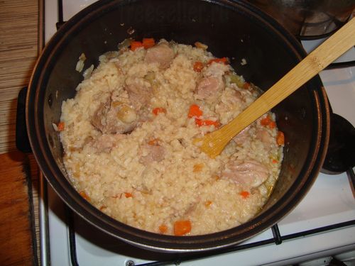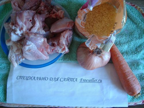 Сначала нарежьте лук, затем порубите морковь на тонкие полоски, а потом продольно порежьте на кусочки. Морковь ни в коем случае не трите, иначе не получится светлого ароматного блюда, тертая морковь при приготовлении лишь окрасит рис в непонятный цвет. Мясо разделяется на крупные куски.