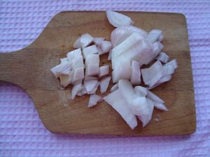 Сначала режется лук для обжарки. Обжаривается он строго на сливочном масле до едва золотистого цвета.