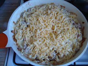 Сыр натирается крупно и засыпается поверх макарон, перемешивать не нужно.
