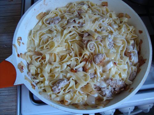 Чтобы наше блюдо не превратилось в традиционные макароны "по-флотски", то необходимо добавить специи, и сметаны (около 3 столовых ложек).