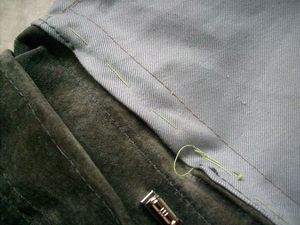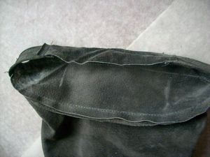 13. Выворачиваем подкладку на лицо. Подворачиваем её верхний срез и нашиваем её по кругу на нижний срез замшевой обтачки верха насколько возможно.
