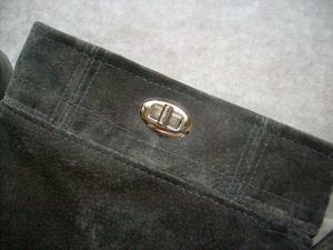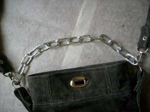 Сшить такую симпатичную дамскую сумочку не только легко, но и приятно. Во-первых, вещи собственного изготовления особенно дороги. Во-вторых, шить из замши - одно удовольствие. Кроме этого всегда популярного материала, мы использовали плотную ткань на подкладку, старый бумагопластовый пакет на вкладыши, а также фурнитуру - шесть заклёпок, две пряжки, два карабина с пряжками, сумочный замочек с поворотной головкой, металлопластиковую цепь с крупными звеньями (30 см), ещё, конечно, нитки, чертёжные и швейные принадлежности.