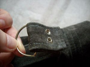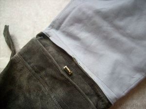 15. Устанавливаем фурнитуру. На ременные верхние концы боковых обтачек надеваем пряжки. Загибаем их вовнутрь и устанавливаем по две заклёпки на каждый.