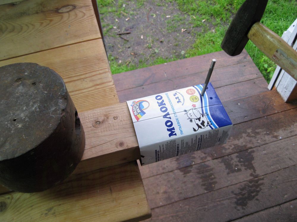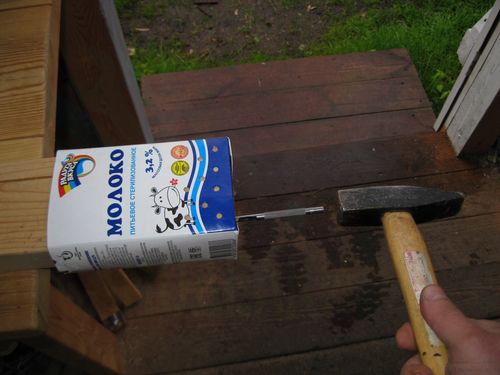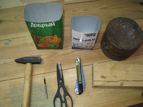 - молоток и пробойник, а также деревянный брусок, на который можно было бы надеть пакет из-под молока.