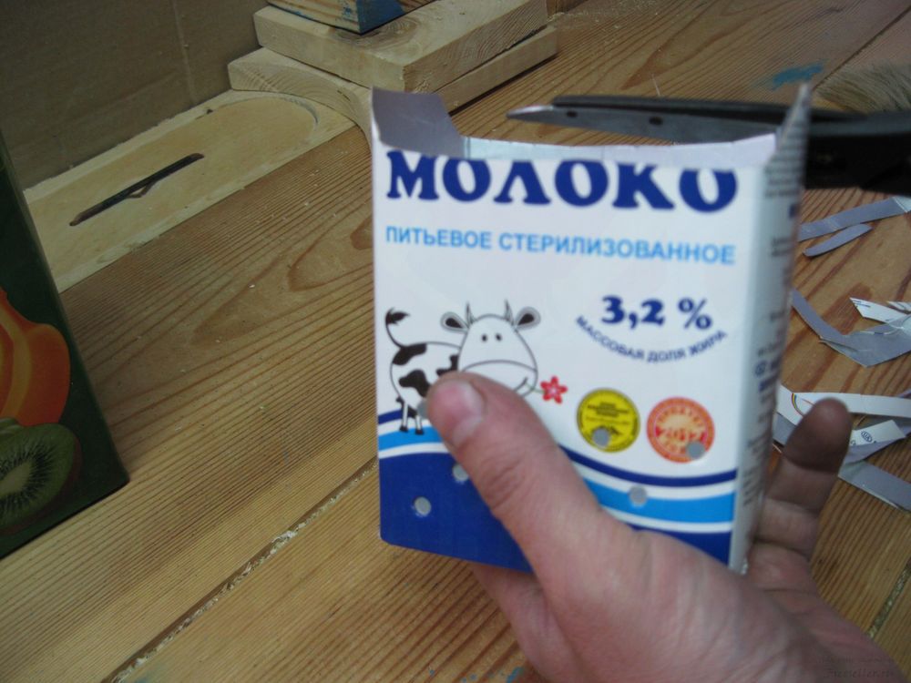 Теперь с помощью ножниц и канцелярского ножа необходимо несколько укоротить наши пакеты, а на молочном пакете можно вырезать и отогнуть удобные ручки.