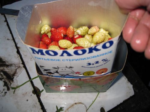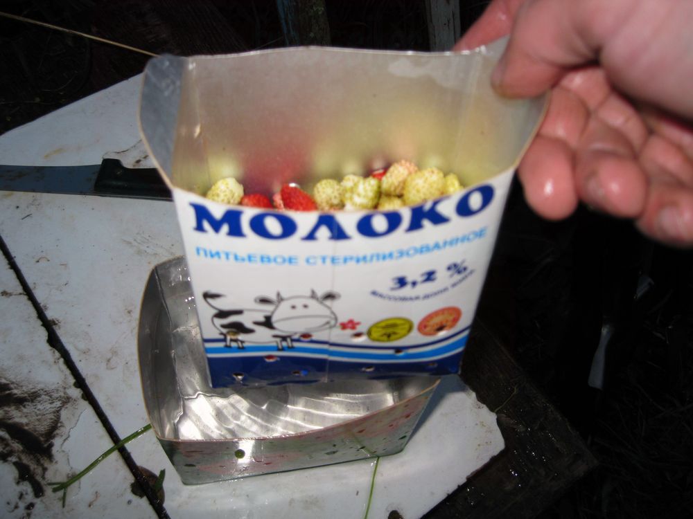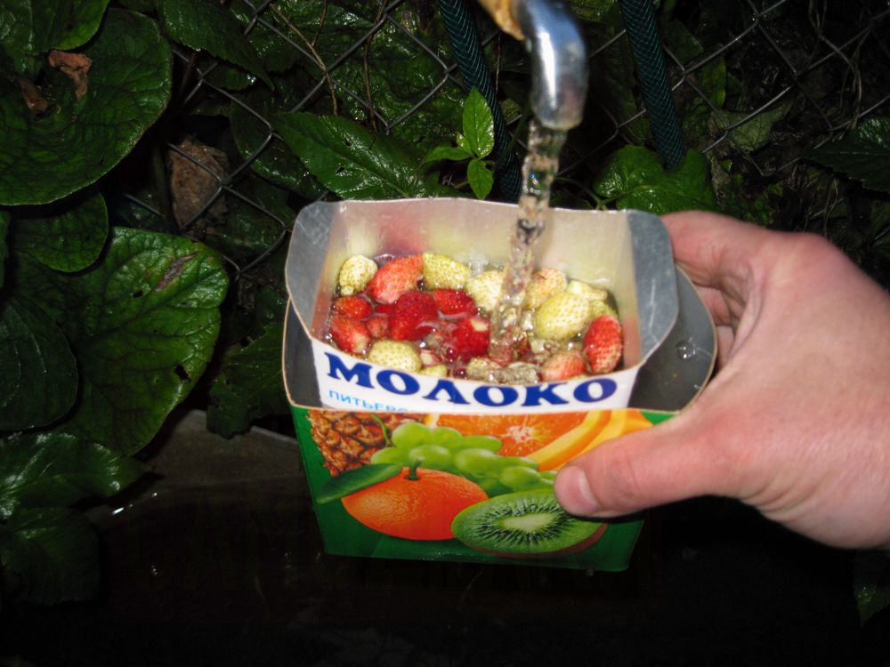 Теперь опробуем его в действии. Для этого соберем во внутренний молочный пакет небольшое количество каких-нибудь ягод, например, земляники.