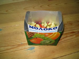 Затем поместим этот пакет во внешний пакет из-под сока и нальем в него воды из садового водопровода.