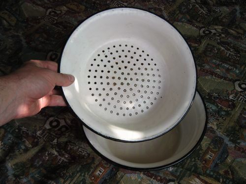 Оно представляет собой набор из двух эмалированных мисок, одна из которых с отверстиями в днище вставляется в другую. Во внутреннюю миску закладываются ягоды, и наливается вода, что позволяет очень хорошо промыть ягоды, плавающие в воде. Но стоит только поднять внутреннюю миску, как вся вода через отверстия стекает из нее в большую внешнюю миску, а в самой внутренней миске остаются чисто вымытые ягоды без воды.