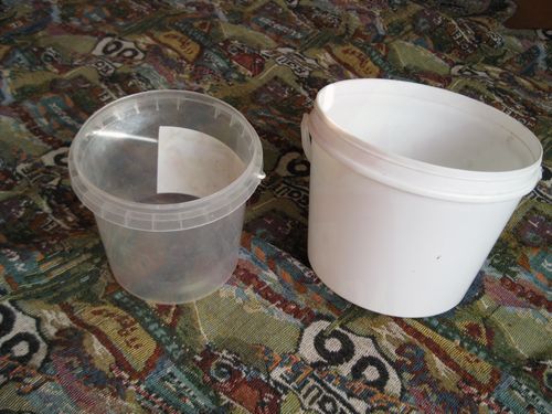Тем не менее, для тех, кто захочет сделать данное приспособление более долговечным, можно воспользоваться другими материалами, например, пластиковыми бутылками, или, скажем, вот такими пластиковыми ведерками из-под сельди или квашеной капусты.