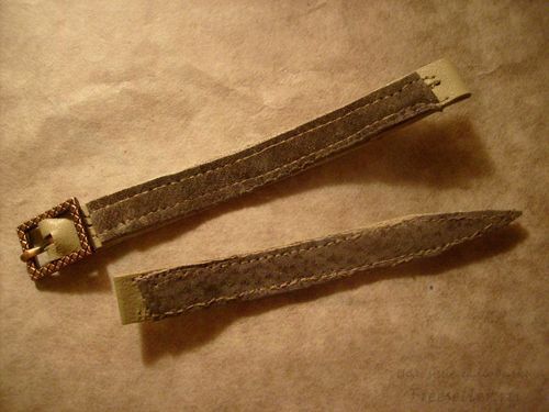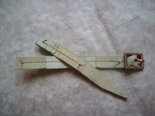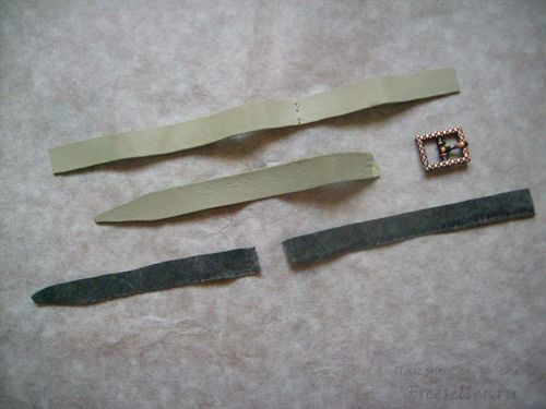 1. Вырезаем из замши две полоски нужной длины (по обхвату запястья) и ширины (по величине "ушек" часов). Из кожи вырезаем две такие же полоски, но с запасом длины на подгибку для крепления пряжки и "ушек".