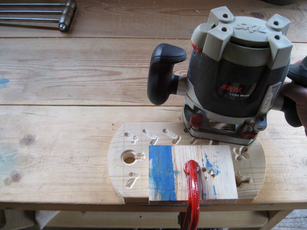Сферической фрезой по дереву раззенковываем отверстия диаметром 6 мм, а ручным фрезером снимаем фаски с больших отверстий.