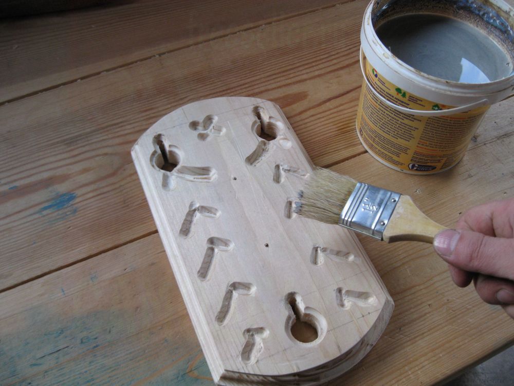 Далее тщательно обрабатываем получившуюся заготовку наждачной бумагой, а затем наносим на нее защитно-декоративное покрытие.