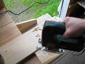 Затем делаем пропилы электролобзиком, формируя навесы под шурупы.