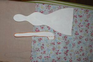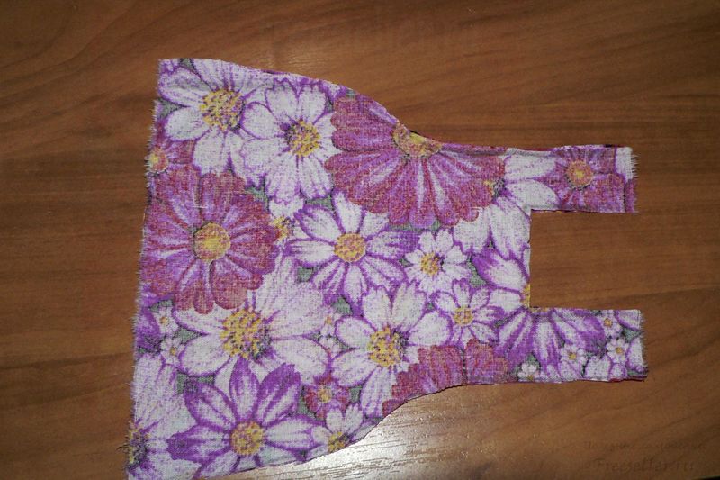 Складываем вдвое ткань другой расцветки, прикладываем выкройку туловища, немного добавляем с краев, чтобы он был просторный. Обводим, вырезаем. Сострачиваем бретели и по бокам, обрабатываем прорези тесьмой. Сарафан готов!