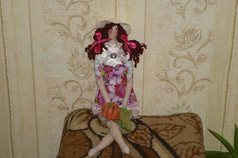 Ну и, конечно же, не забудьте дать ей в руки какой-нибудь овощ (у нас это тыковка из полимерной глины). Ну вот, видно, что лето прошло не зря!