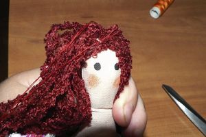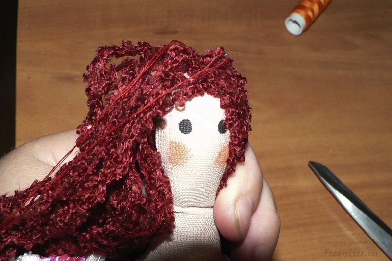 Как же нашей девочке обойтись без шевелюры? Если у Вас нет готовых трессов, возьмите пряжу попушистее, наберите прядей из пряжи, и по середине головы, прямо над лбом, прошейте пробор, как следует закрепите нить.