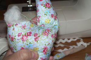 Строчим детали по контуру, оставляя место для набивания, и только потом вырезаем с припуском на швы, обрабатываем их зигзагом.
