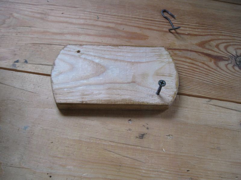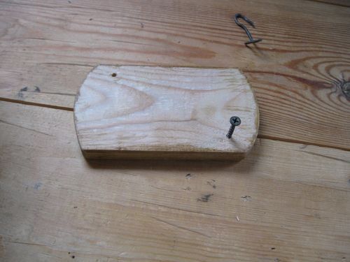 Теперь с изнаночной стороны нашей деревянной детали неглубоко вворачиваем шуруп. Если в детали есть отверстия (как в данном случае), то можно ввернуть шуруп прямо в одно из отверстий.