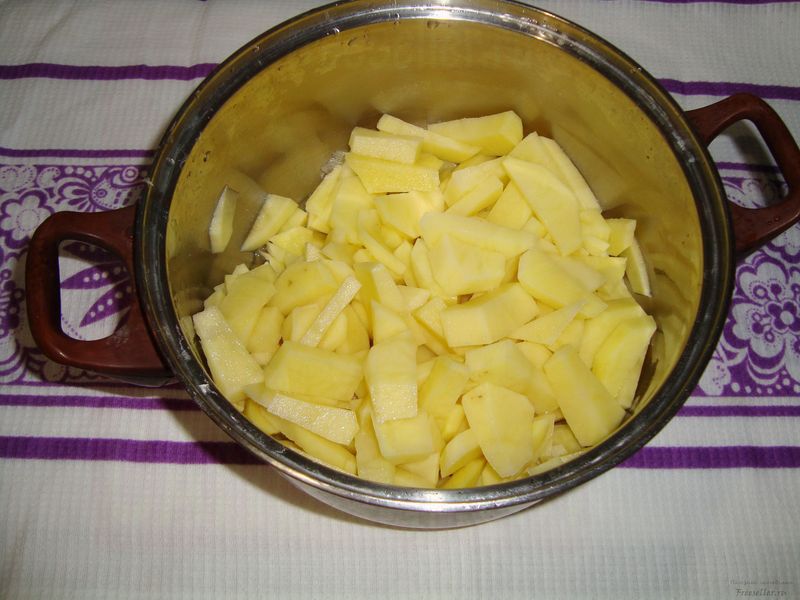 Картошка чистится и нарезается тонкими дольками или кубиками любого размера.