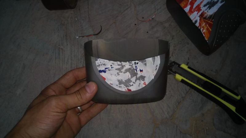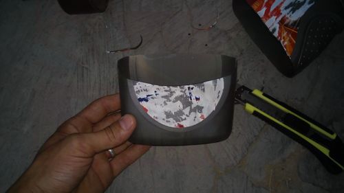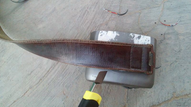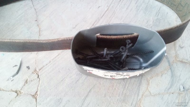 Далее на заднюю стенку контейнера прикладываем ремень и отмечаем места, где будем проделывать отверстия, и при помощи ножа вырезаем их.