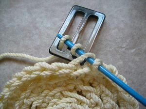 В последнем ряду на равном расстоянии друг от друга вплетаем пряжки, закрепляя их за срединную перекладину. Они нужны для жёсткости конструкции.