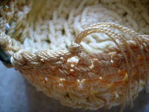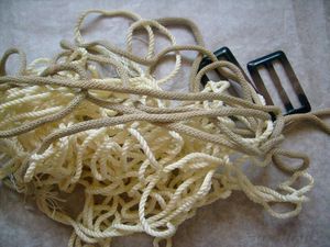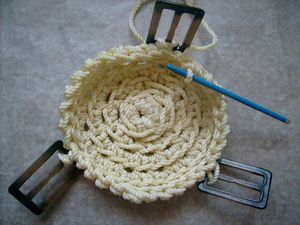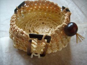 Из старых верёвок, трёх пластмассовых пряжек от старого плаща и большой деревянной бусины мы смастерили оригинальную вазочку-корзинку. Верёвки (разной толщины и даже цвета - в зависимости от возраста :e113: ) у нас ушло в общей сложности около пяти метров. Корзинка получилась диаметром около 15 см и высотой около 7 см. В работе нам пригодились крупный вязальный крючок и ножницы.