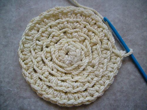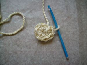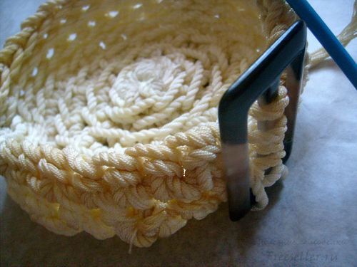 1. Вязание начинаем с дна. Из самой толстой верёвки вяжем круг столбиками без накида, начав из центра с колечка. В первом ряду провязываем четыре столбика. Во втором из каждого столбика провязываем по два. Далее провязываем по два только из каждого второго столбика.