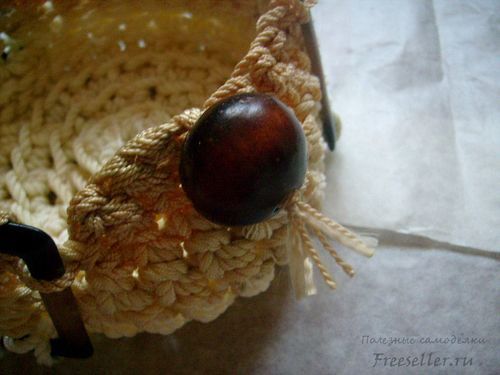 Конец можно аккуратно спрятать. Мы же решили украсить его крупной деревянной бусиной.