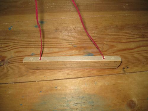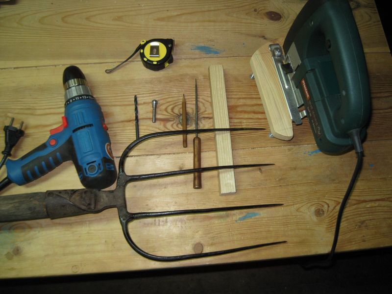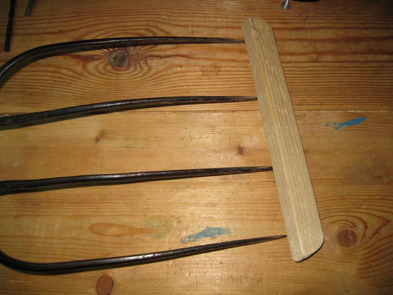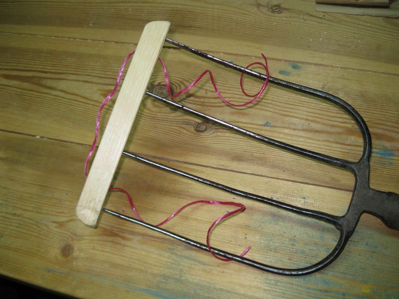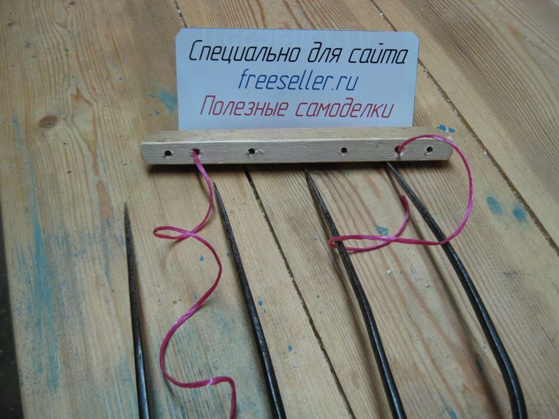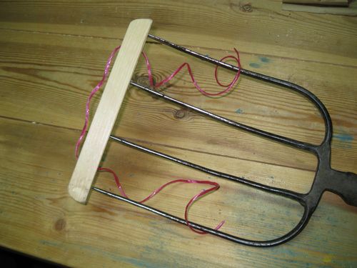 - Деревянная дощечка или планка толщиной и шириной 2,5-3 см, и длиной на 3-4 см, больше расстояния между крайними зубьями вил;