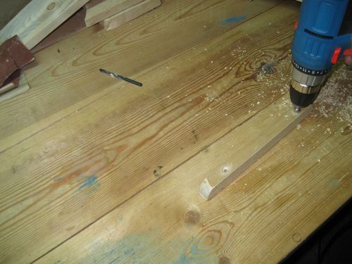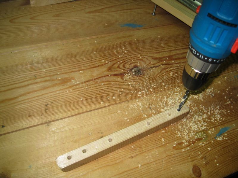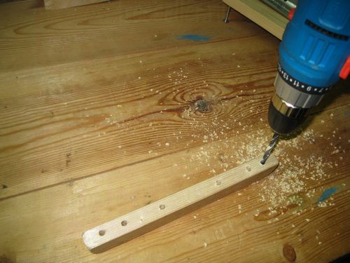 Накалываем их шилом и сверлим глухие отверстия глубиной примерно 10-15 мм, для зубьев вил. Кроме того, с боков сверлим по два сквозных отверстия, в которые мы будем продевать веревку.