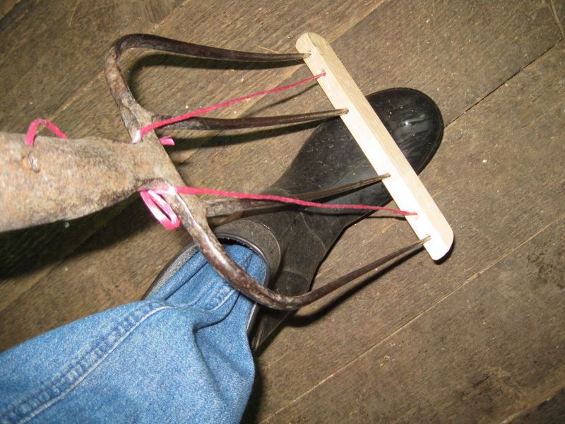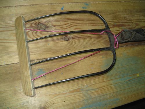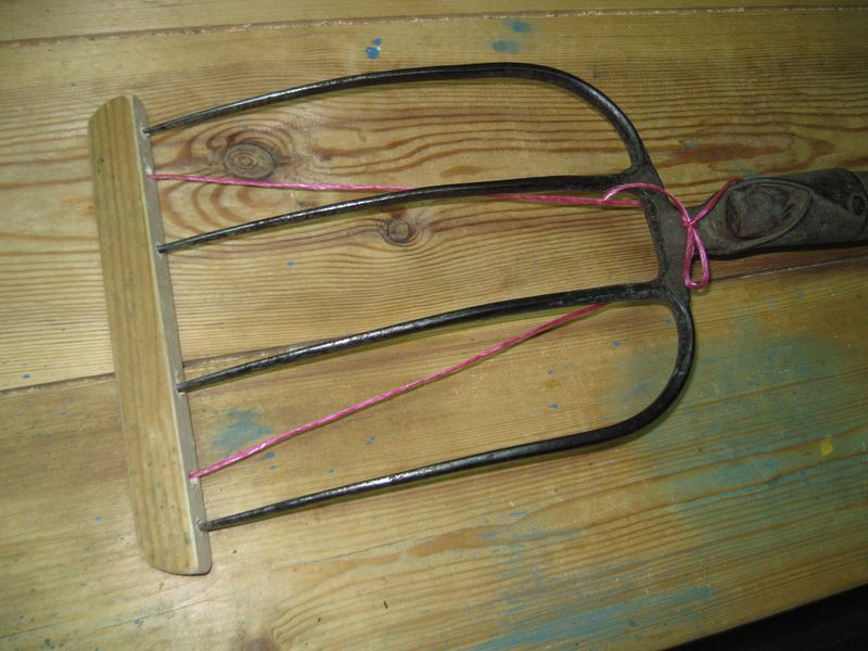 И подвязываем ее к основанию зубьев веревкой, для того, чтобы наша дощечка не соскочила.