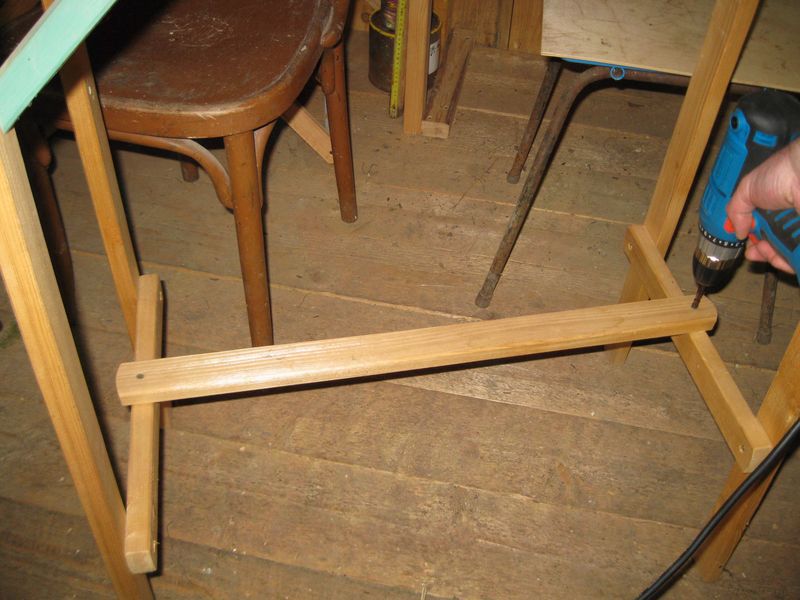 Причем в качестве одной из планок можно использовать уже готовую поперечную планку, заранее открутив ее с нижней части ножек столика.