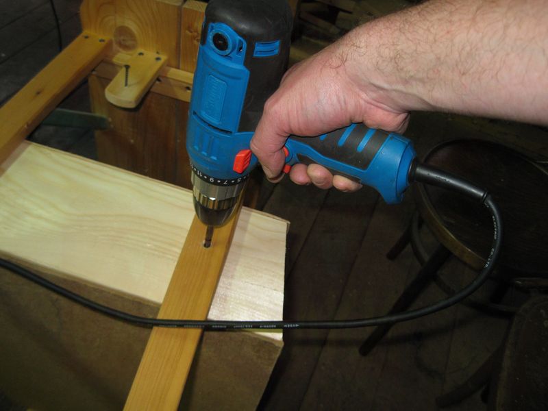 Теперь сверлим в каждой ножке столика по одному отверстию на одинаковой высоте.