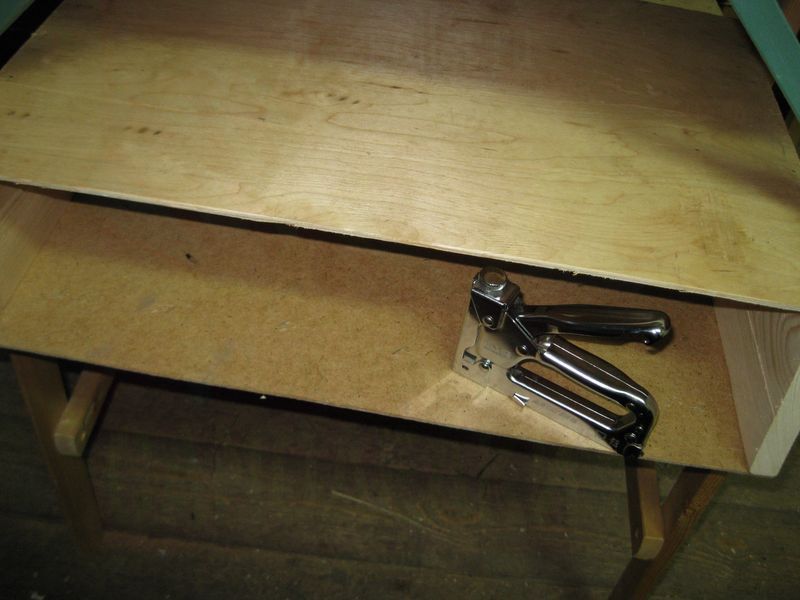Теперь необходимо прикрепить оргалит к планкам для большей прочности и жесткости. Причем, поскольку гвоздиками это делать неудобно, воспользуемся строительным степлером со скобами.