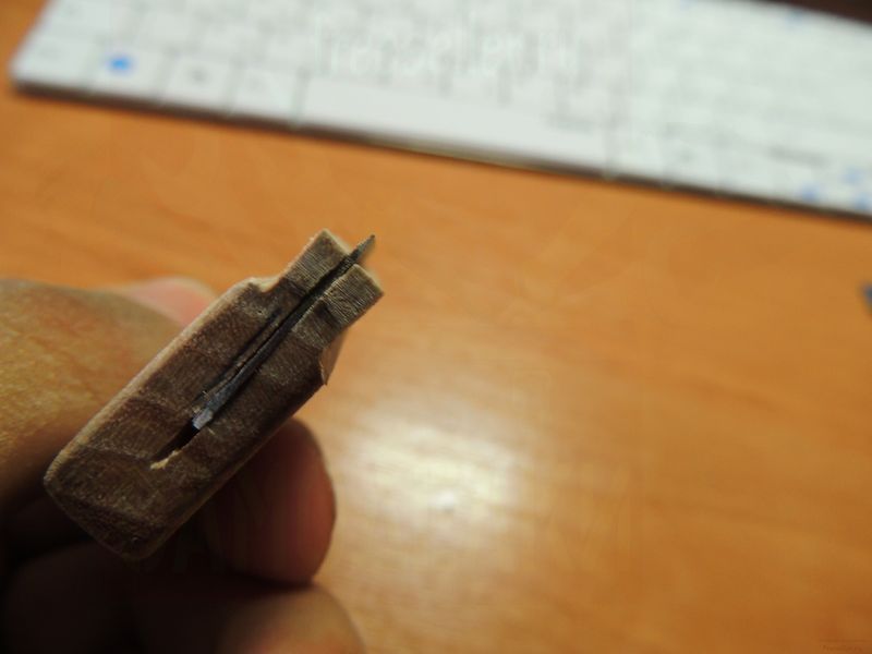 Теперь берем нашу крышечку, размечаем середину и делаем канавку, постоянно примеряя, чтобы она одевалась с небольшим усилием, а также делаем прорезь для лезвия.