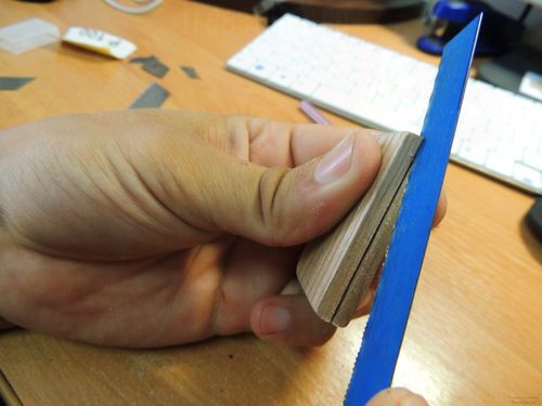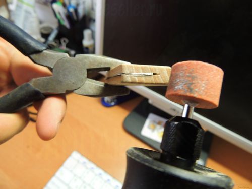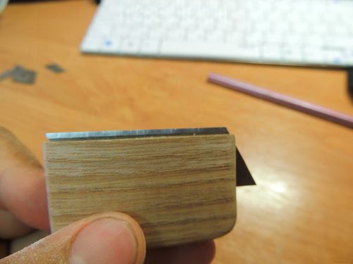 Так как лезвие не ровное - стачиваем выпирающую часть вровень с дощечкой.