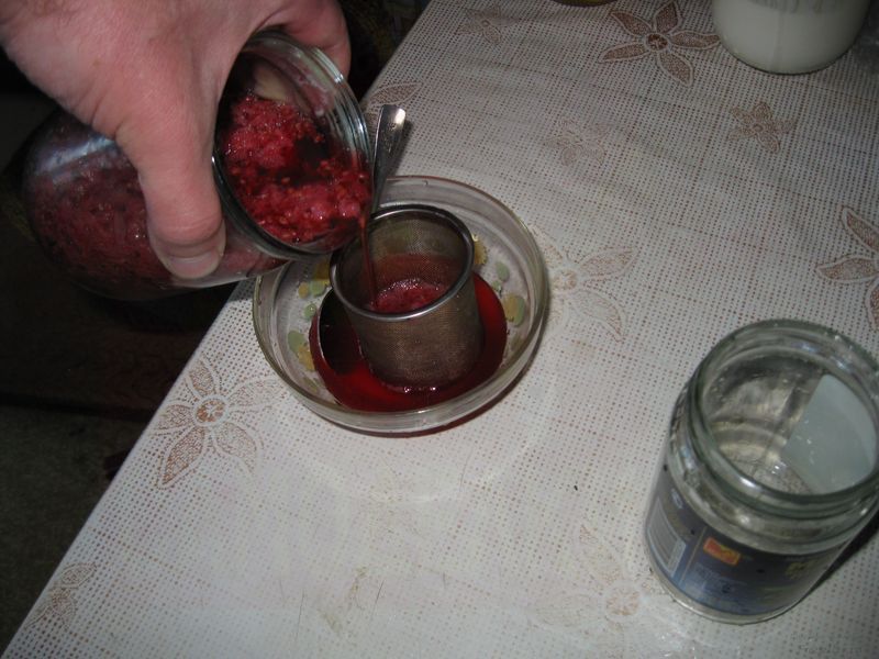 Как только это произошло, необходимо процедить содержимое нашей банки через марлю, или мелкое сито. Я, например, для этой цели использую мелкое сито от старого заварочного чайника.